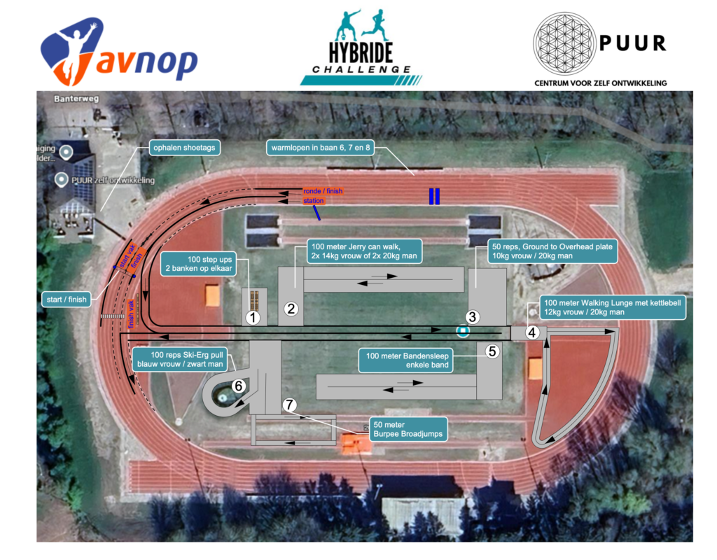 Voor, tussen en na elk onderdeel loop je 2 rondes over de atletiekbaan en tussen de stations. Dit is ongeveer 1000 meter.