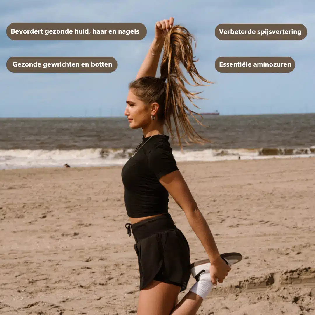 Collageen is een belangrijk lijmvormend eiwit in het lichaam dat goed is voor zo’n 30% van onze totale eiwitmassa. Je vindt het terug in allerlei soorten weefsels, waar het structuur en elasticiteit aan geeft. Daarnaast zorgt het voor de stevigheid en elasticiteit van de huid. Na ons 25ste levensjaar maakt ons lichaam steeds minder collageen aan. Dit is een natuurlijk proces. Na ons 50ste levensjaar maakt ons lichaam dit eiwit zelfs bijna helemaal niet meer aan. Dit uit zich in rimpeltjes en een minder stevige huid. Daarom kan het handig zijn om deze te suppleren.