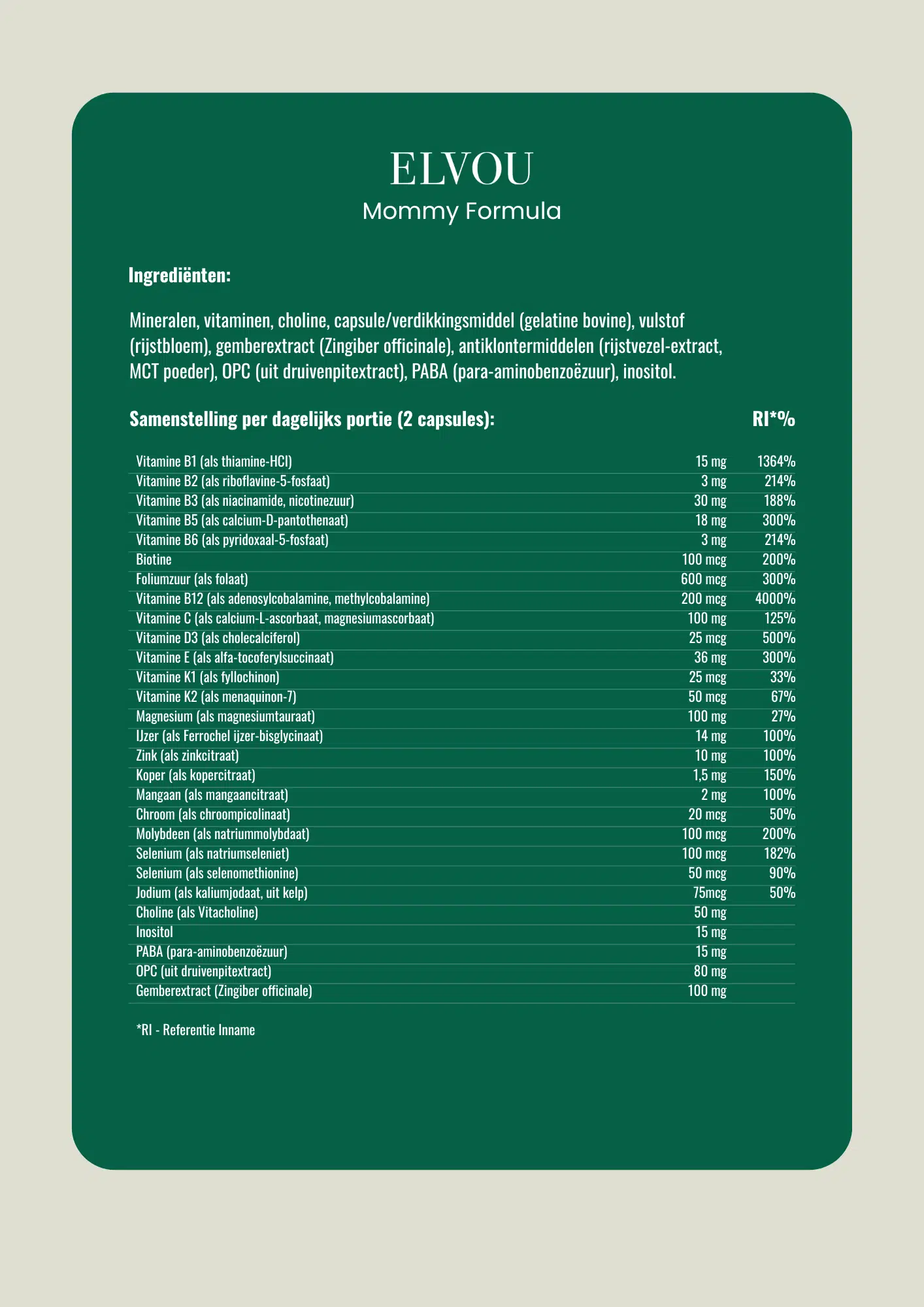 De Mommy Formula bevat alle belangrijke micronutriënten voor de preconceptiefase, zwangerschap, in verantwoorde, goed opneembare vormen. Denk aan bioactieve B-vitaminen, natuurlijke vitamine D3, ijzer in bisglycinaatvorm, gecoate vitamine K2, en choline. Uniek is de toevoeging van een flinke dosis gestandaardiseerd gemberextract. Deze formule mag worden gebruikt vóór de zwangerschap, tijdens de zwangerschap en tijdens het geven van borstvoeding!